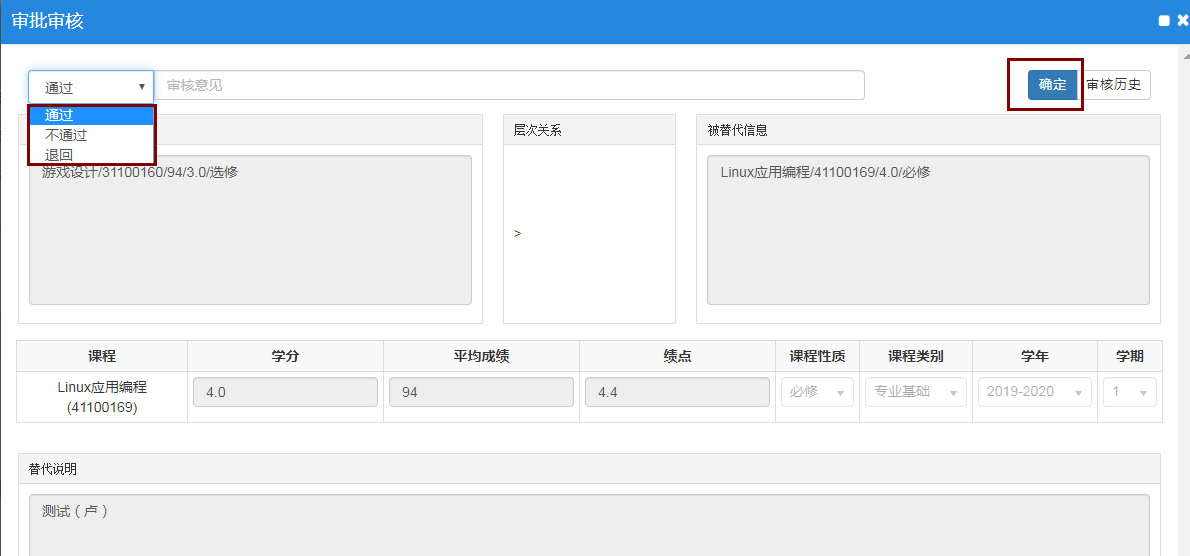 5、根据学分替换规则,教秘选择审核意见(如教秘可以确定,就直接选择,如不能确定,可征询员工所在教研室主任意见或公司主管教学副经理意见后,进行审核),在这里可以选择“通过”还是“不通过”,或“退回”,然后填写审核意见,然后点右边“确定”,完成审核,如果是“通过”则审核流程进入到公司主管教学副经理处进行审核。