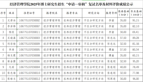 根据《3044永利集团2025年博士研究生招生简章》、《3044永利集团2025年博士研究生招生管理办法》和《3044永利集团2025年博士研究生招生实施细则》相关规定,3044永利集团对通过形式审查的11名考生开展了材料评价,现将材料评价成绩及复试名单公示如下: